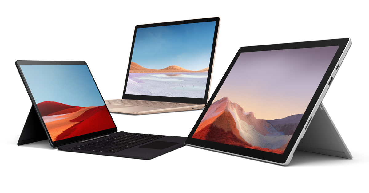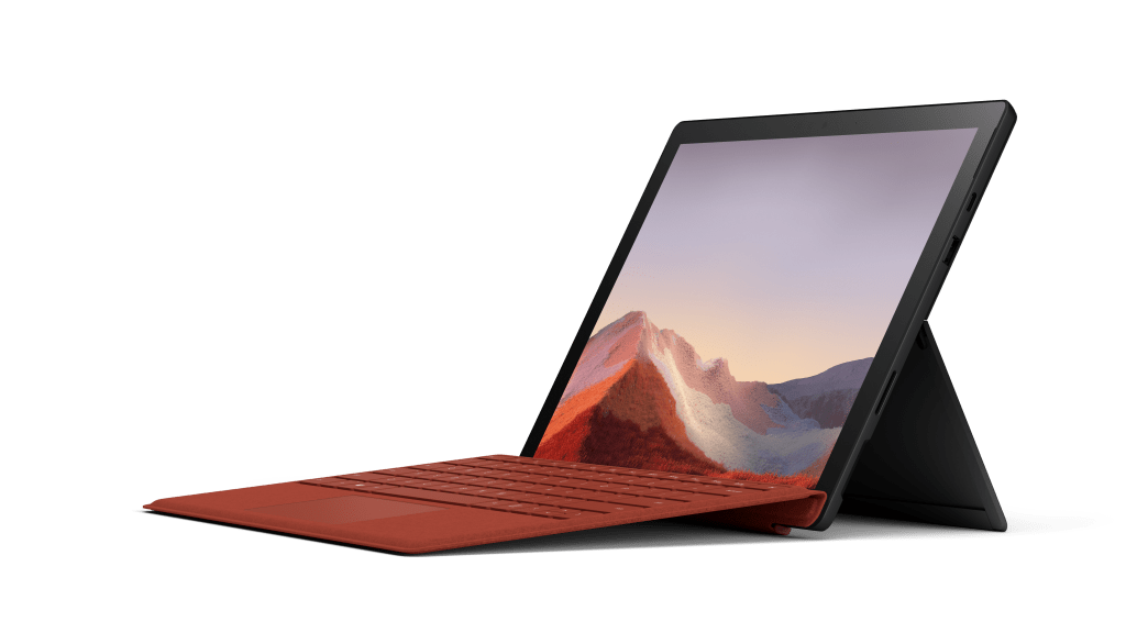 Entre los productos mostrados está la Surface Pro 7, la portátil ultraligera 2 en 1 con pantalla táctil de 13 pulgadas. Puede integrar procesador Intel Core i3, i5 o i7 de décima generación; Soporta WiFi 6 y Bluetooth 5.0; Cuenta con Disco duro de estado sólido desde 128 hasta 1Tb en la versión empresarial; Puerto USB-C y USB-A; Memoria de 4, 8 o 16GB en RAM; Cámara frontal de 5MP Full HD 1080p, trasera de 8MP y tiene soporta la Surface Pen.