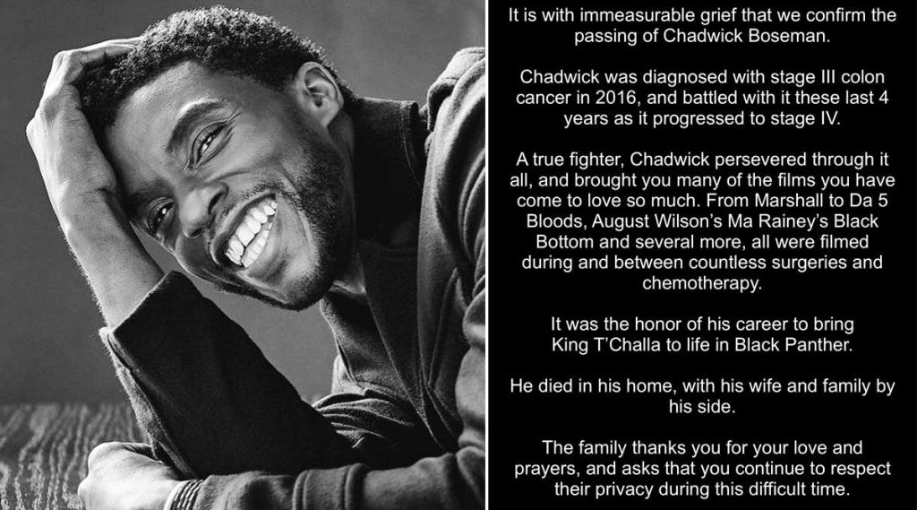 A través de su cuenta de Twitter se dio a conocer la noticia que el protagonista de Black Panther, Chadwick Boseman murió el día viernes 28 de agosto de 2020 a causa de una larga batalla contra el cáncer que comenzó en 2016.