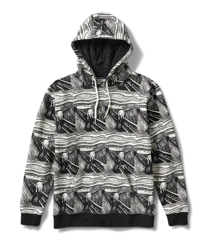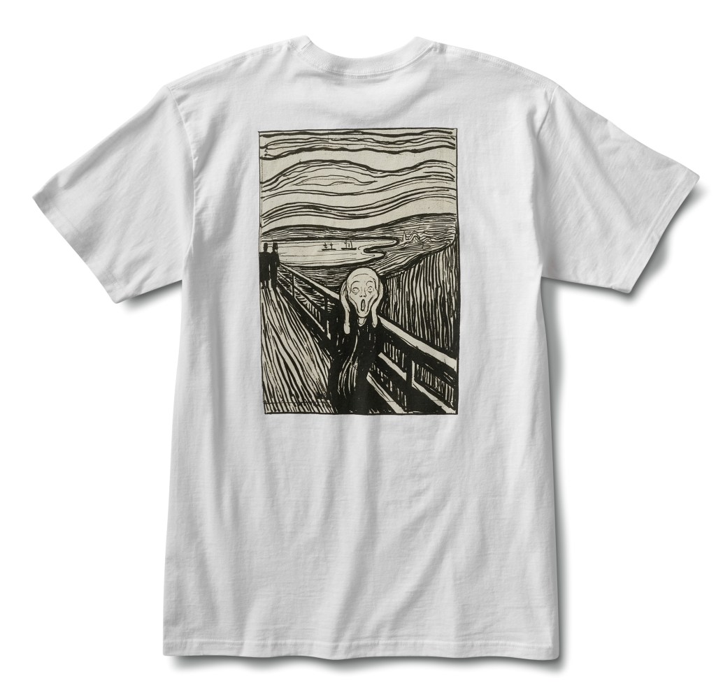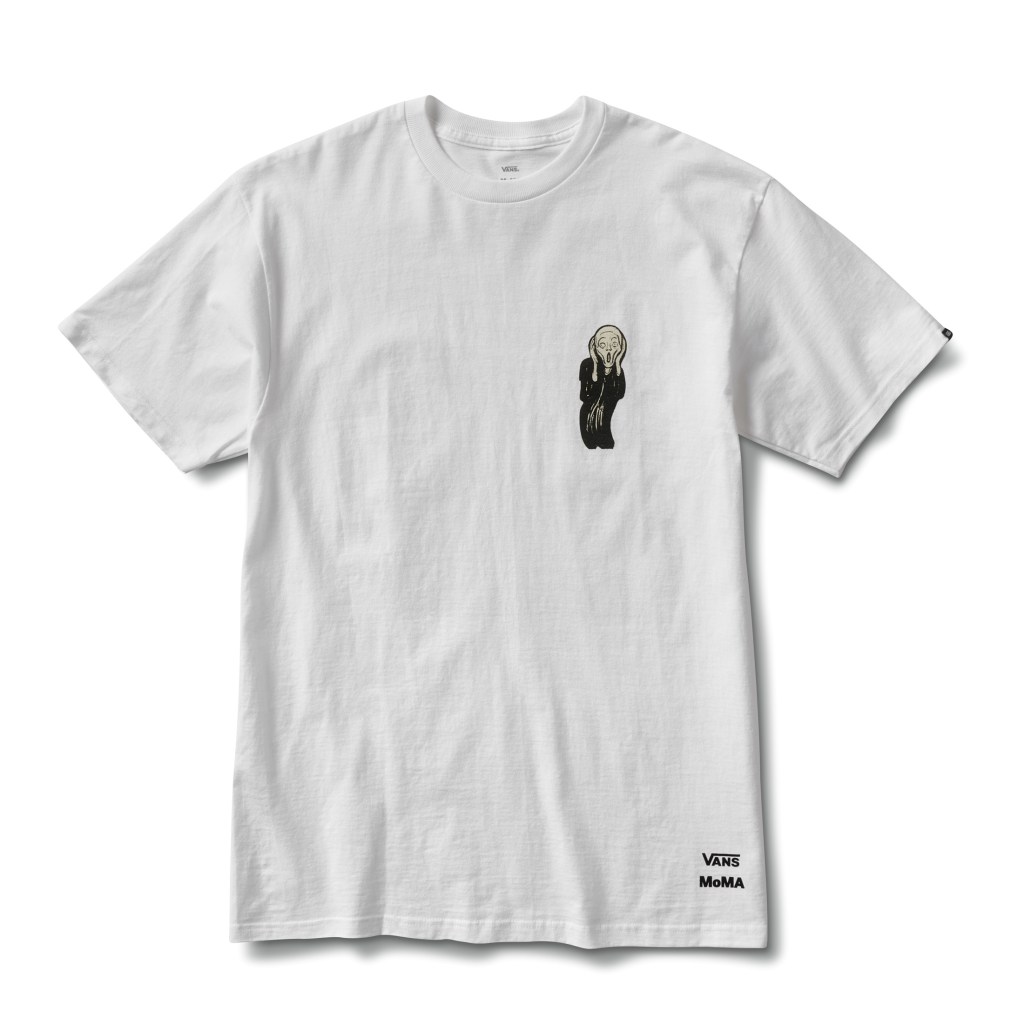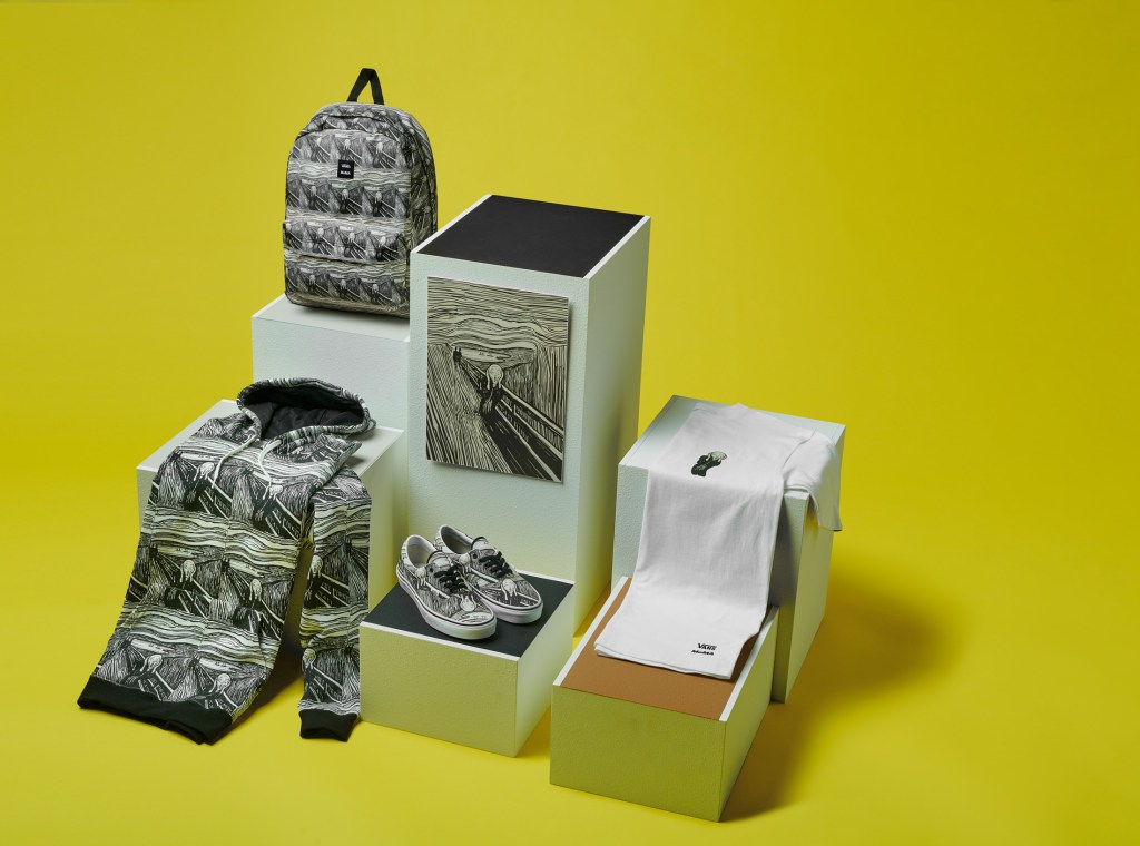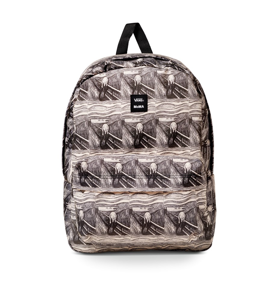 “El grito de 1895”, de Edvard Munch está capturado en cada uno de los paneles de lienzo de los clásicos Era de Vans y un patrón repetido de la misma obra se encuentra en la mochila de Old Skool, en la camiseta de manga corta y en la sudadera con capucha.