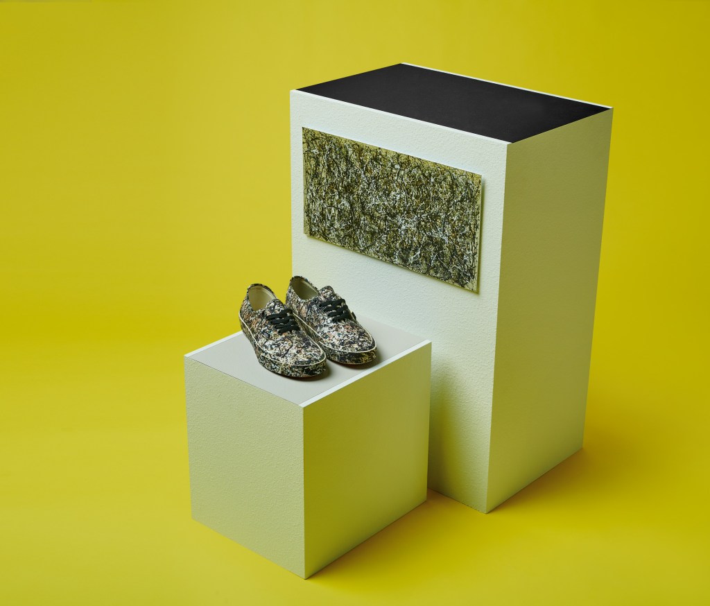 La obra de Jackson Pollock, Uno: Número 31 de 1950 adorna en su totalidad los Authentic de Vans y la gorra.