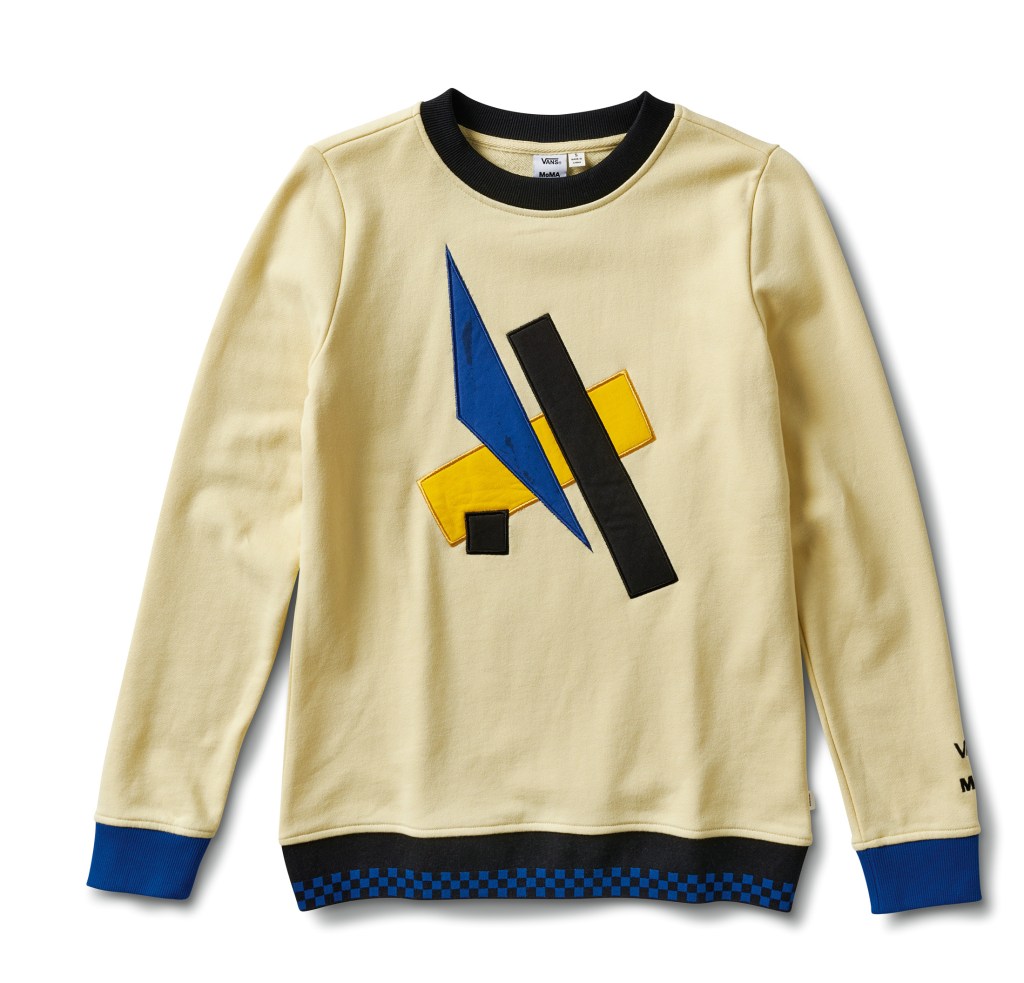 La pieza de Popova, “Sin título, 1917” está impresa en los Sk8-Hi utilizando cada lado para traducir su visión vanguardista y al frente de la sudadera y playera de manga corta .