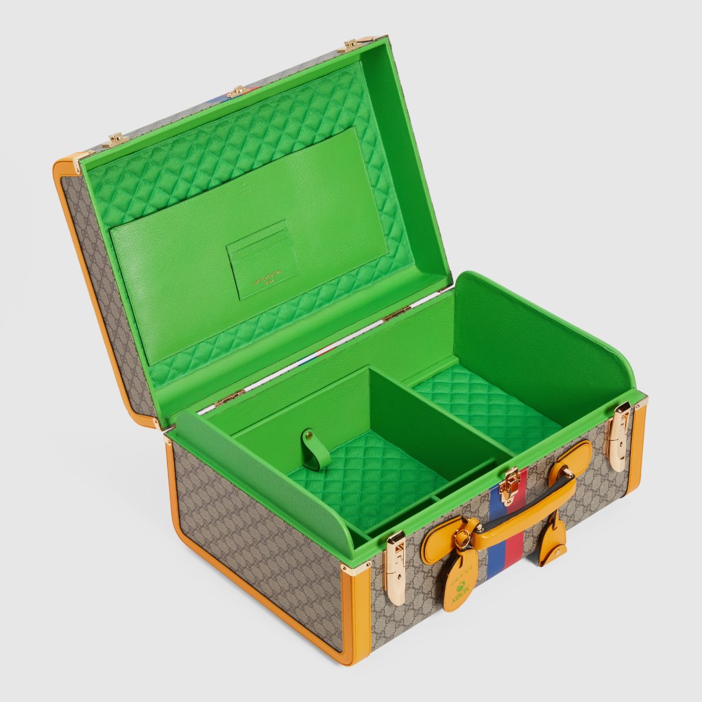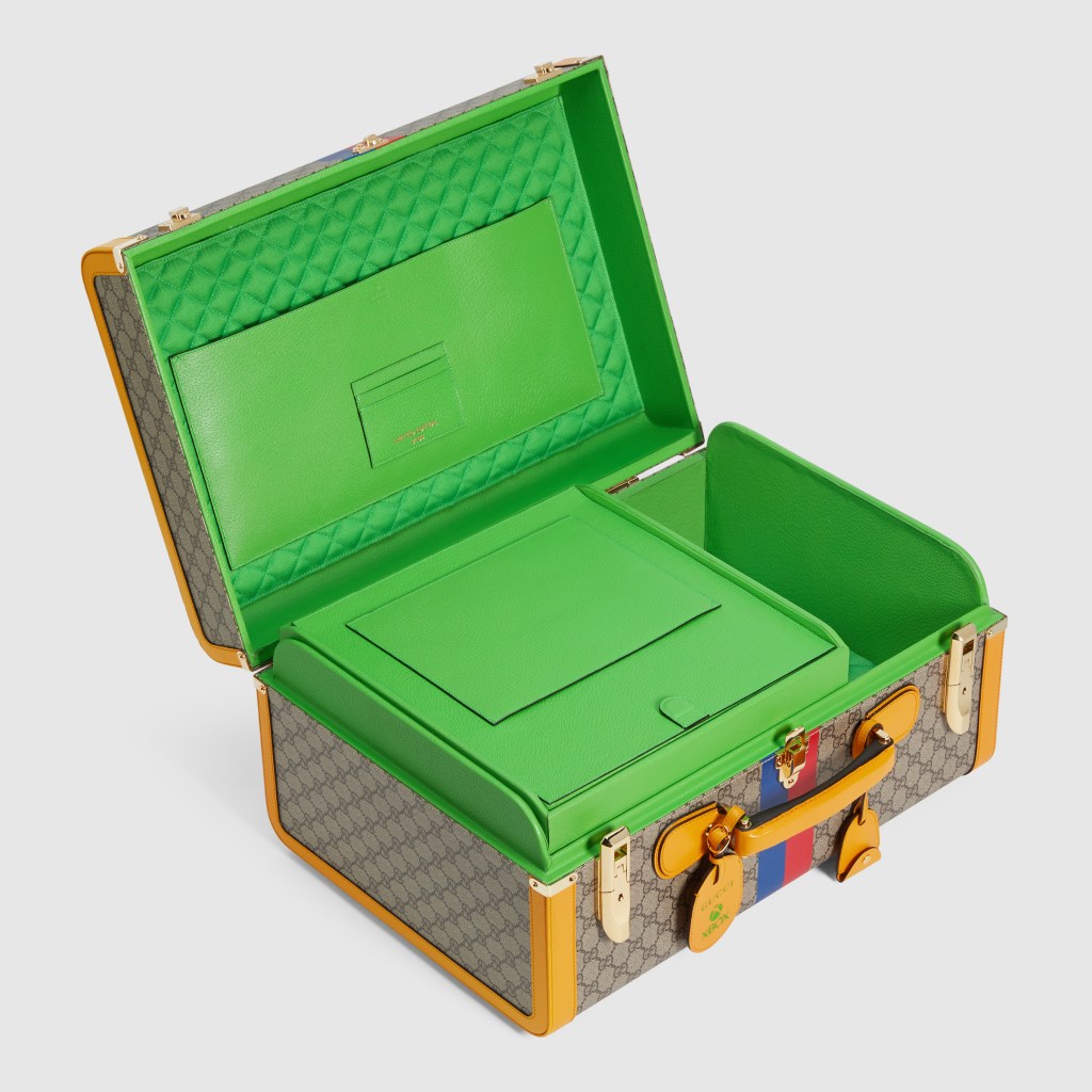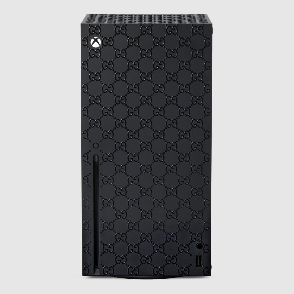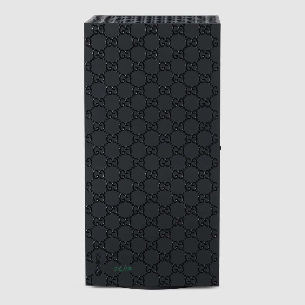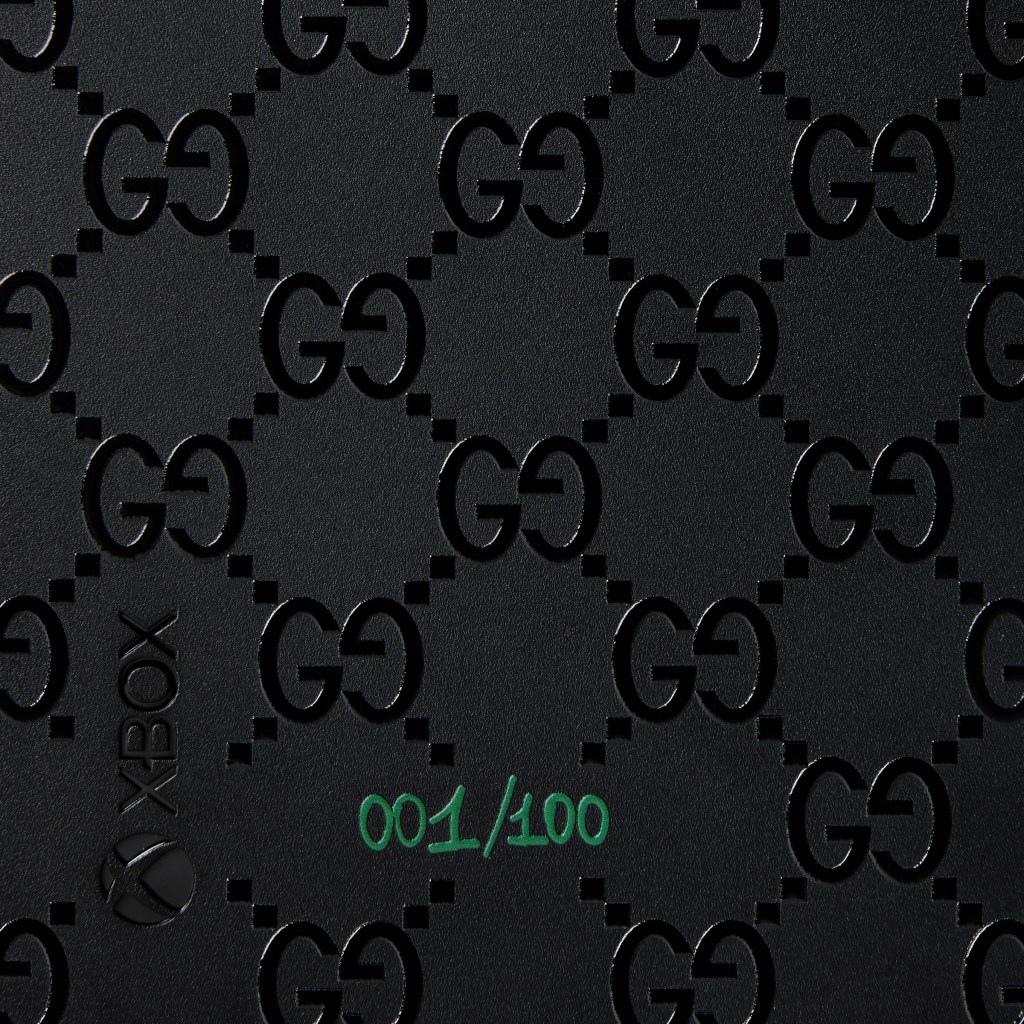 Esta colaboración comprende 100 conjuntos numerados, cada uno con una consola Xbox Series X personalizada con un patrón GG grabado con láser, dos controles inalámbricos de Xbox Carbon Black con la franja web de Gucci en rojo y azul, complementados por un estuche duro inspirado en el equipaje de archivo de Gucci. La caja está cubierta con el famoso lienzo beige Gucci Supreme, con capturas doradas y adornos de cuero amarillo. Una franja web roja y azul corre a su alrededor, mientras que la palabra “XBOX” está escrito en la tapa en el color verde.